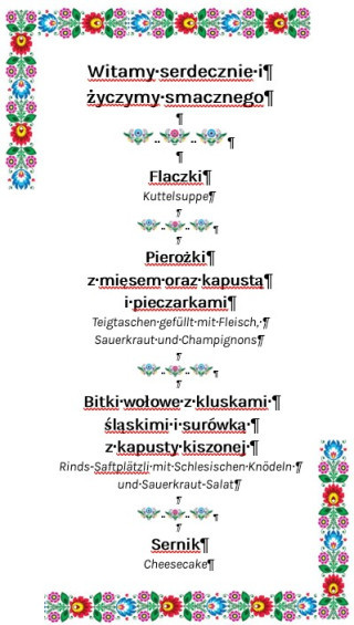 An diesem besonderen Tag servieren wir Ihnen traditionelle polnische Speisen, liebevoll zubereitet von unseren talentierten Köchen direkt aus Polen. Freuen Sie sich auf authentische Gerichte, die mit viel Herz und nach Originalrezepten zubereitet werden.